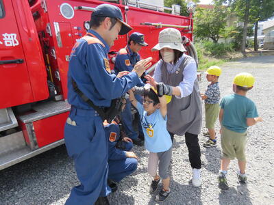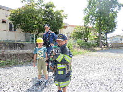 その後,消火訓練の様子を観察し,最後は消防車を見学したり消防服を着せてもらったりと貴重な経験をしました。何があっても自分の命を守れるよう,今回の経験を生かせるようになればと思いました。