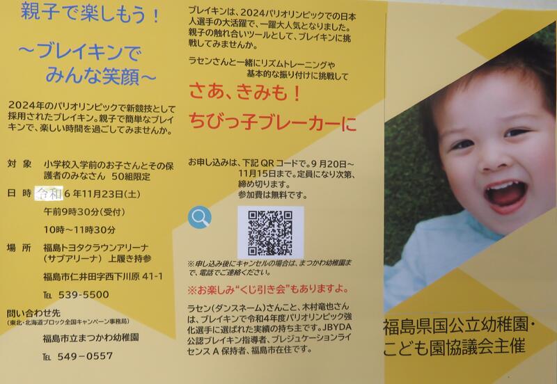来る11月23日(土)、”親子で楽しい触れ合いの時間を過ごしてもらおう”という趣旨で、『ブレイキンでみんな笑顔』を開催いたします。