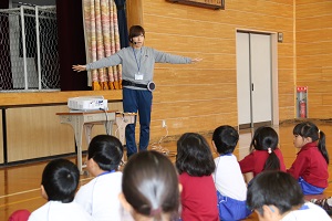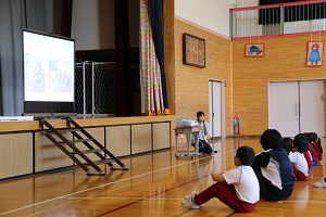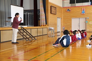 次に、福島市健康推進課の保健師さん、福島市こども政策課の理学療法士さんの指導により、「『よい姿勢』と健康」についての講話と実技がありました。