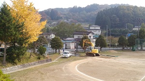 保護者の皆様には、プリントにてお知らせしたとおりですが、校庭に仮置してありました、除染土の掘り起こし、搬出作業が始まりました。