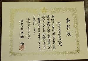 これまでの交通安全教室の実施や集団登校での安全な登校、児童の交通事故0などが、認められたものです。