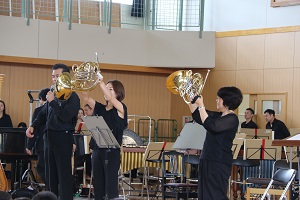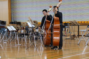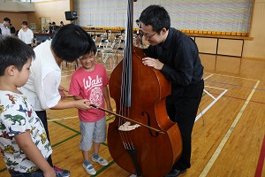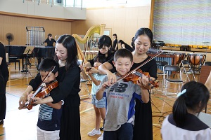 さらに、オーケストラ用に編曲された演奏に合わせて校歌を歌い、最後に弦楽器の演奏体験をさせていただきました。