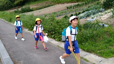 昨日から明日まで、5・6年生が宿泊学習で不在のために、1~4年生での集団登校となります。