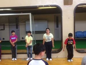 2日目、朝のつどいでは、代表として前へ出て、ラジオ体操の模範を行いました。