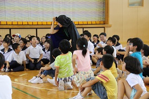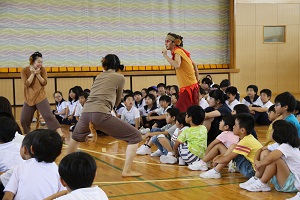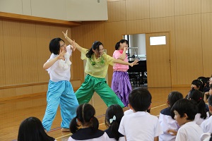 すぐ目の前で、繰り広げられる劇に、子どもたちは見入ったり、一緒に歌を歌ったりしていました。
