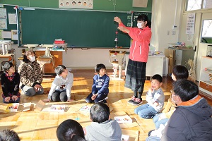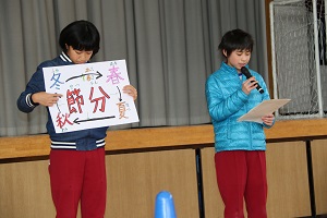 はじめに、生活委員会から、節分の意味や豆まきの由来、ヒイラギの葉やイワシの頭を玄関に飾るわけなどについての話がありました。