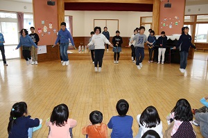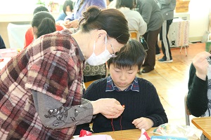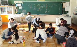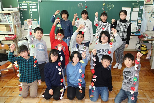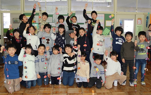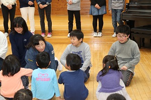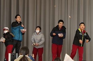 最後に、年男・年女の5・6年生、教師が、ステージより豆をまき、皆で豆を拾いました。