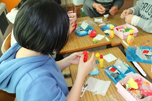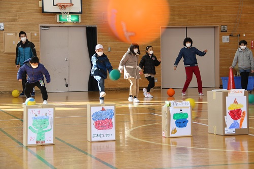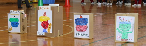 次に、全校生による、縦割り班対抗ゲーム「おにを追い出せ」を行いました。鬼をかいたダンボールめがけボールを蹴り、相手の陣地へ追い出します。数多く追い出したチームの勝ちとなります。子どもたちが考えた心の鬼は次の8つでした。