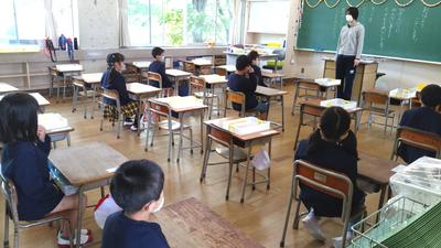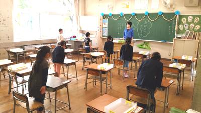今回は、「3密」を少しでも解消するために、学区ごとの時間差登校としました。