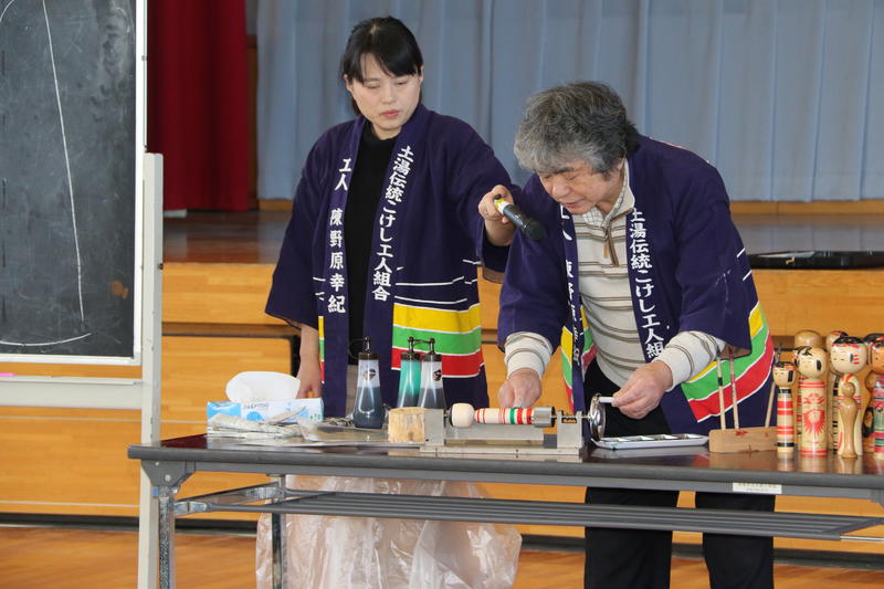 土湯伝統こけし工人組合の方にお越しいただき、ろくろを使った模様の付け方や顔のかき方を教えていただきました。