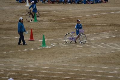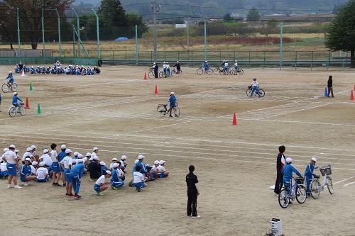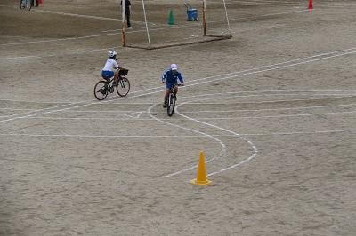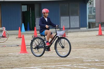 校庭に、道路や交差点をかき、実際に自転車に乗りながら、安全な横断の仕方について学習しました。
