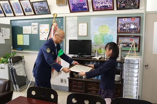 本日、福島警察署長様に来校いただき、大森小学校校長室にて「地域安全作文」の表彰状伝達式を行いました。