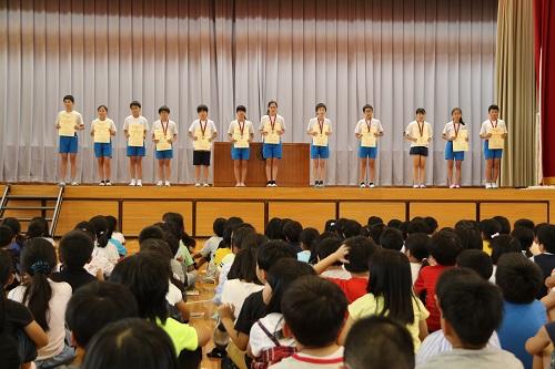 全校集会において、6月2日(日)に行われた、全国小学生陸上競技交流大会福島県大会県北地区予選に出場し、入賞した子どもたちの紹介をしました。