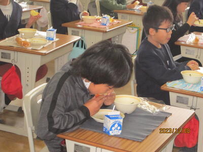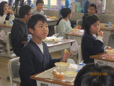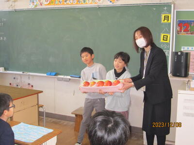 2023年12月8日 12時40分本日の給食に、本校4年生が明成高校で摘果作業をした