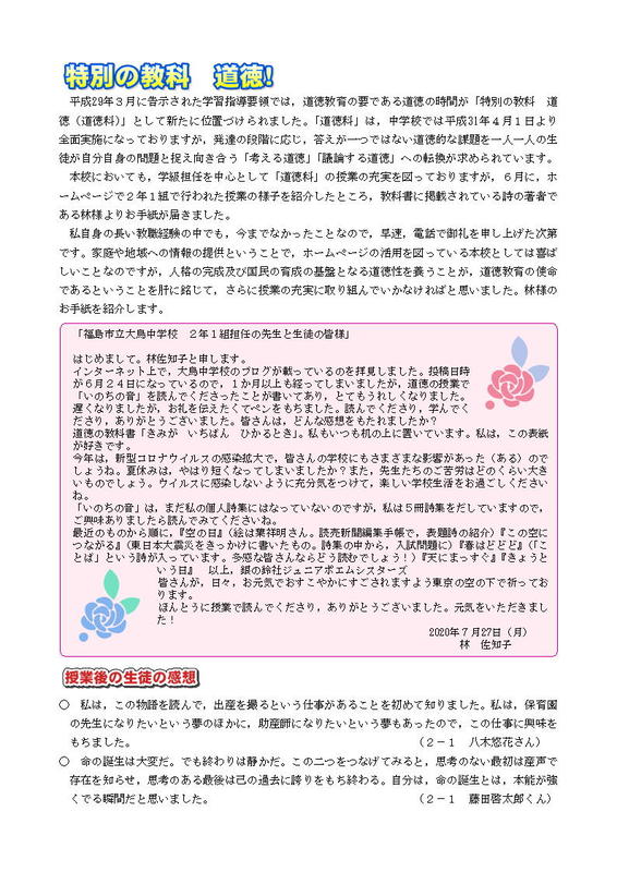 2025年6月18日 14時46分第1学年だよりの掲載について。どうぞご覧ください。