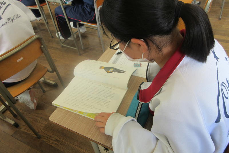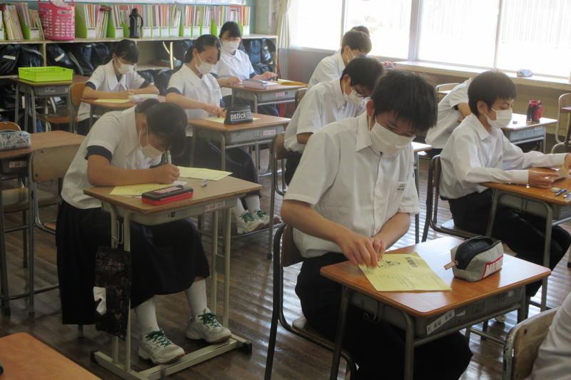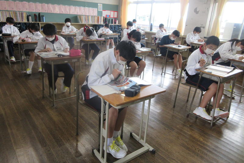 3-2の4校時は「向上心、個性の伸長」についての道徳の授業でした。教科書にある重松 清さんの「がんばれ おまえ」を読んだ後、日頃の生活を振り返り、自分自身のよさや個性を見いだし、よりよく生きるために大切なことについて理解を深めました。