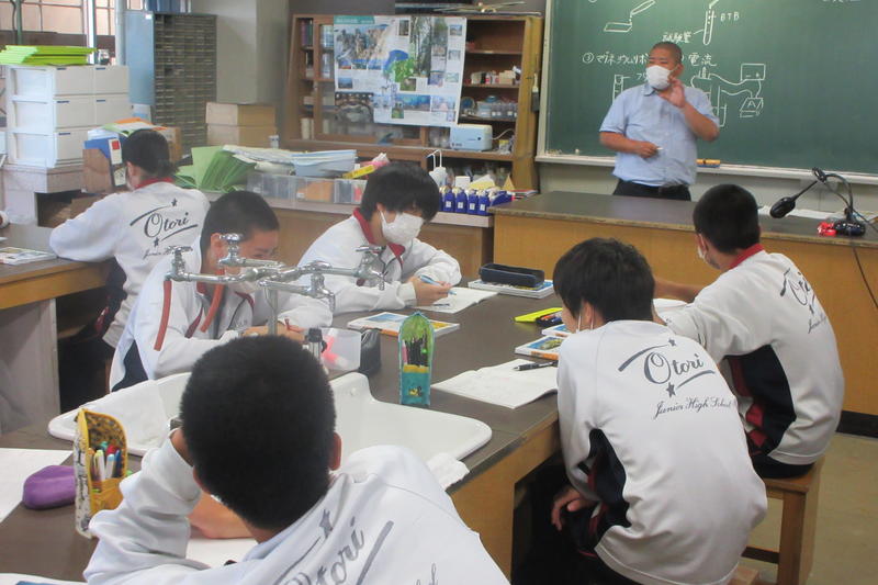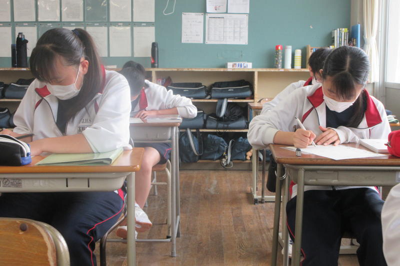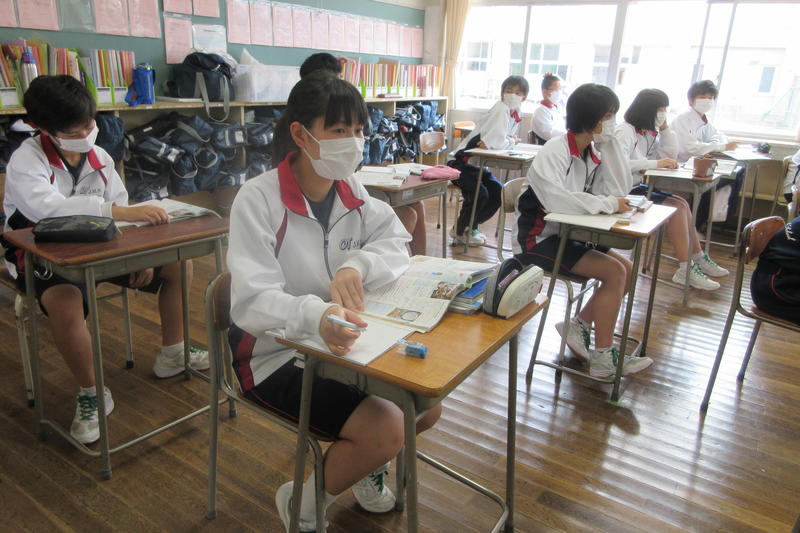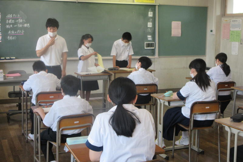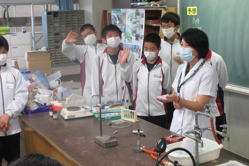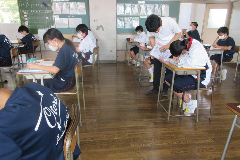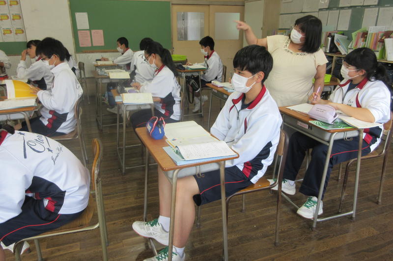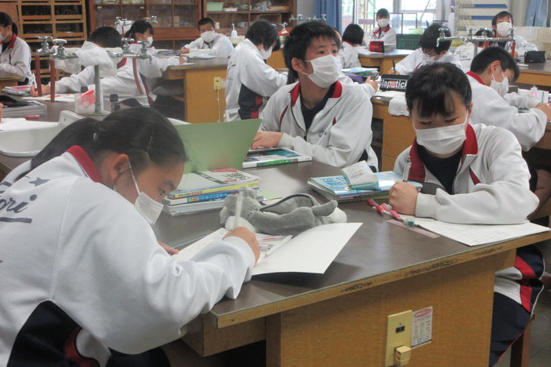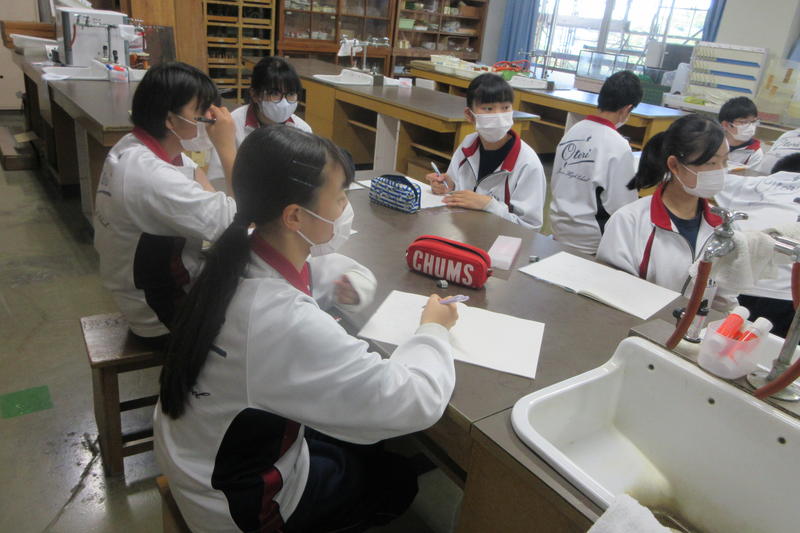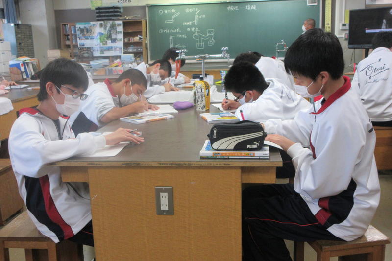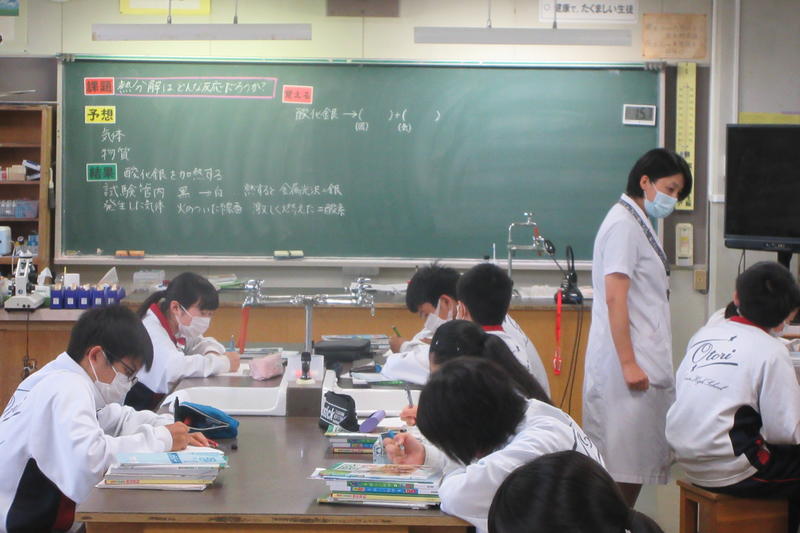 2-1の4校時は理科の授業でした。教師が行う実験を見た後、「熱分解は、どんな反応だろうか」という課題に取り組みました。実験中の発問にも積極的に答えていました。また、この授業は、予想、実験、結果と課題確認、覚える、まとめなど、1時間の授業の中で、生徒たちが何をすべきかが分かりやすい構造的な板書になっていました。