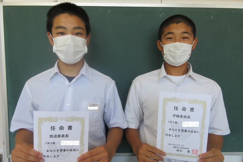 今日の朝会は、3密を避けるために、放送による朝会となりましたが、各専門委員長並びに学級委員の任命式を行いました。一人一人呼名した後、校長より代表生徒に任命書が渡されました。