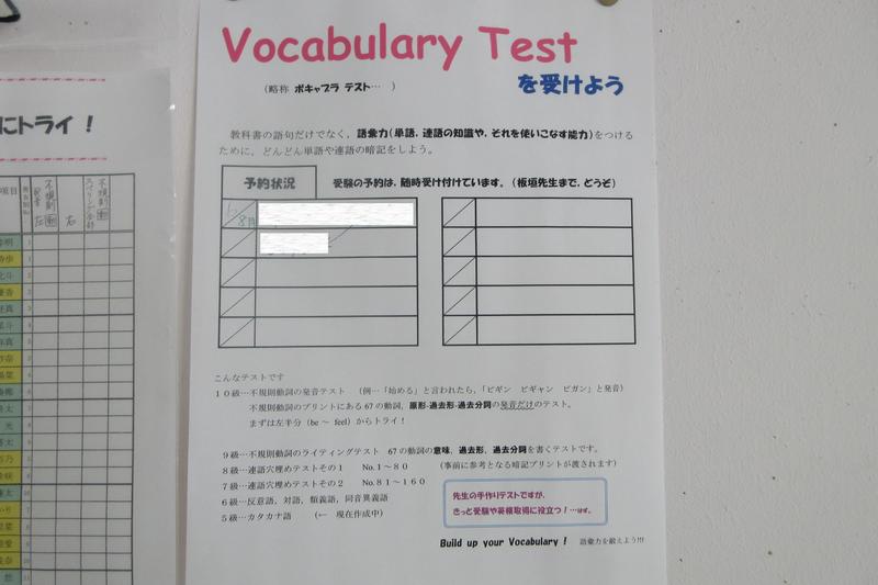 2年生の廊下には、「Vocabulary Test」についての掲示がありました。語彙力(単語、連語の知識や、それを使いこなす能力)を高める取り組みです。希望者が自ら申し込む形になっています。