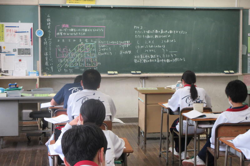 2-1の5校時は数学の授業でした。「カレンダーの数をいろいろ囲むとどのような性質が見つかるだろうか」という課題に取り組みました。一人一人カレンダーを囲み、囲まれた数字にどんな性質があるのかを考え、Xを用いて表現していました。