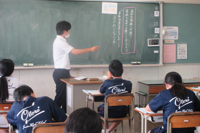 1-1は「家族愛、家庭生活の充実」について考える授業でした。「自分の家族への想い、家族の自分への想いを考えよう」というテーマのもと、教師の体験談を交えながら、日常の生活を振り返り、考えを深めました。