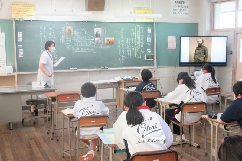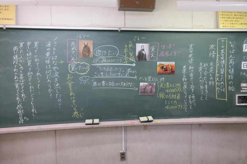 1-2は「友情、信頼」について考える授業でした。「真の友情を築くためにはどんなことが大切だろう」というテーマのもと、ミレーとルソーの画家としての考えと、友達としての考えについて、意見交換を行いながら考えを深めました。また、この授業はICTや絵画(写真)の活用が工夫されていました。