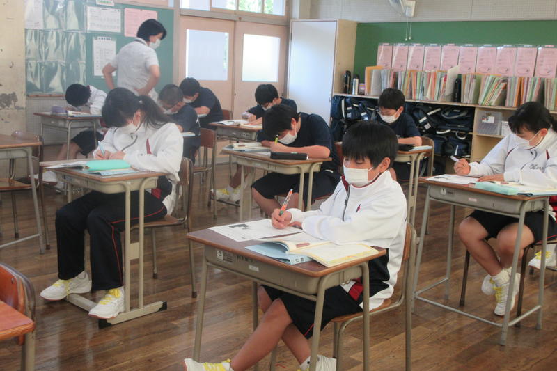 3-1の2校時は理科の授業でした。リトマス紙やBTB溶液等による、酸性、中性、アルカリ性の見分け方についての学習でした。教師の発問に積極的に答えている姿が見られました。説明を聞く時間、発問に答える時間、ノートに書き込む時間等、時間の使い方がはっきり区別されている授業でした。