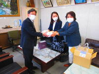 本日,飯坂学習センター館長 河内敏夫 様,飯坂婦人会代表 村島勤子 様,飯坂あひるっ子広場代表 内藤美紀 様が来校され,生徒たちのために,3週間をかけて作成した手作りマスク285枚をプレゼントしていただきました。来校されました3名の方々の他に,作成にご協力いただきました団体様は次のとおりです。
