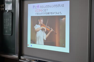まず、スクリーンに緞帳と「大笹生小学校コンサートホールにようこそ」の表示が映し出され、子どもたちはどんな音楽が流れるかドキドキしながら見ていました。はじめに2年生で学習したメヌエット(ベツォルト)が流れ、続いて3年生で学習するメヌエット(ベートーベン)が流れ、子どもたちは口ずさみながら聴いていました。
