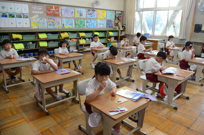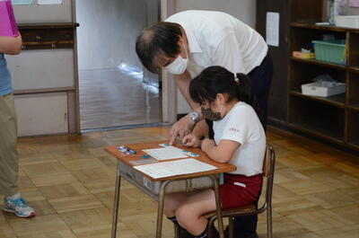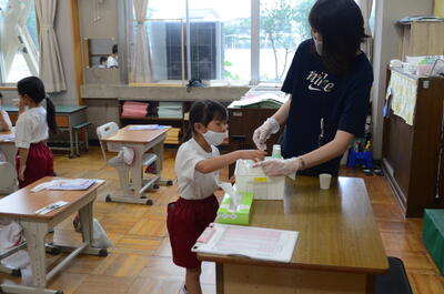 毎週金曜日の朝はフッ素洗口を行っています。小さな紙コップのフッ素溶液を1分ほど口に含み、吐き出します。そうすると、歯にフッ素のコーティングがされ、虫歯になりにくい歯になるということです。歯は健康の源です。これからも自分の歯を大切にしてほしいと思います。