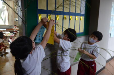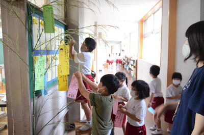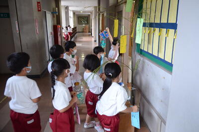 ふつかはたなばたのかざりつけをおこないました。きんじょのひとからもらってきたささだけに 1・2ねんせいがねがいごとやかざりをつけました。「さっかあせんしゅになれますように。」「ぷろやきゅうせんしゅになれますように」「かんごしさんになれますように。」「がっこうのせんせいになれますように。」などなりたいものがかかれていました。また、「ころながなくなりますように。」「だれもころなにかかりませんように。」「かぞくみんながげんきでいますように。」など、みんなのことをかんがえたねがいもありました。ひとりひとりのねがいが ほしにとどいて かなえられますように。