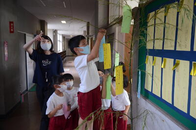2日は七夕の飾りつけを行いました。昨日、近所の方からいただいた笹竹に1・2年生が願い事や工夫して作った飾りをつけていました。一人一人の願い事を見ると「サッカー選手になれますように。」「プロ野球選手になれますように。」「看護師さんになれますように。」「学校の先生になれますように。」など、将来の夢が書かれていました。また、「コロナがなくなりますように。」「誰もコロナにかかりませんように。」「家族みんながげんきでいますように。」など、みんなのことを考えた願いもありました。一人ひとりの願いがアルタイル・ベガ・デネブ・天の川に届き、かなえられますように。