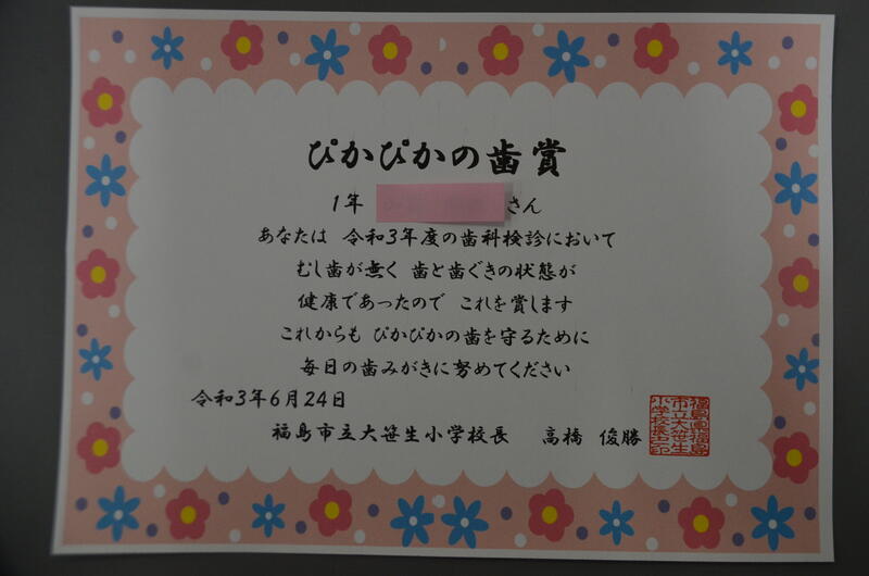 本日は全校集会でよい歯の表彰が行われました。学校歯科医様に検診していただき、よい歯(未処置歯・要注意乳歯なし、歯垢の付着なし、歯肉の状態良好)と認められ表彰された児童は68名(2名未検査)中36名で全体の53%でした。また、処置歯もなく虫歯0の児童は20名でした。表彰後に、養護教諭から歯科検診の結果や歯の健康についての話がありました。今後も自分の歯を自分で大切にしていって欲しいと思います。