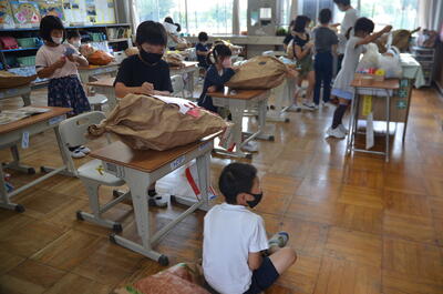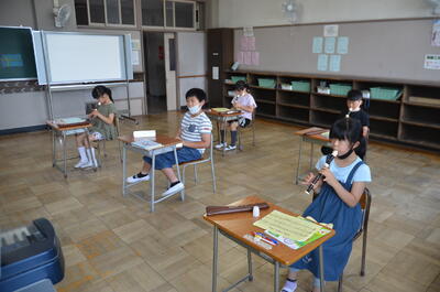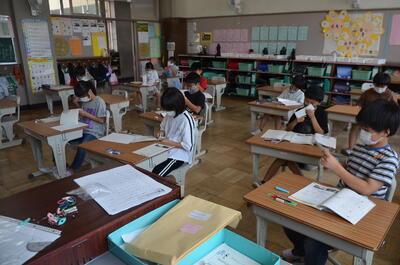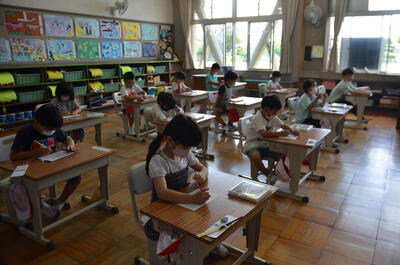 本日は今年2度目の土曜授業でした。今回は、通常の授業を行いました。2時間目の授業の様子です。1年生は生活、2年生は図工、3年生は音楽、4年生は算数、5・6年生は体育でした。朝はまだ雨が残っていたのですが、2時間目ごろは日差しもさしてきて、水泳学習を行うことができました。