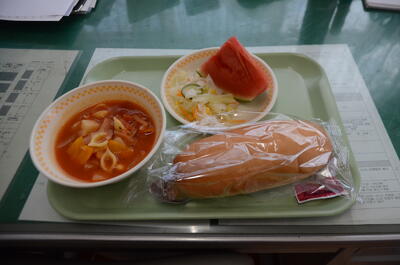 今日の給食はすいかが出ました。朝からむし暑かったので、子どもたちには何よりのデザートでした。他のメニューは、パン フレンチサラダ ミネストローネ 牛乳 マーシャルビーンズでした。