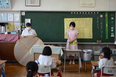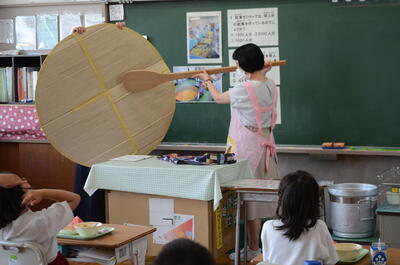 また、北部給食センターから栄養士の方、事務の方が2年教室においでになり、クイズを通して給食のことについて教えてくださいました。3000人分の給食を20名の方が作っていること、大きな鍋で1000人分のスープを作っていることなどを、実際の鍋の大きさの段ボール紙や鍋をかき混ぜる巨大なへらを示しながら教えてくださいました。最後に、いつも給食を残さず食べていることをほめていただき、子どもたちも笑顔でした。