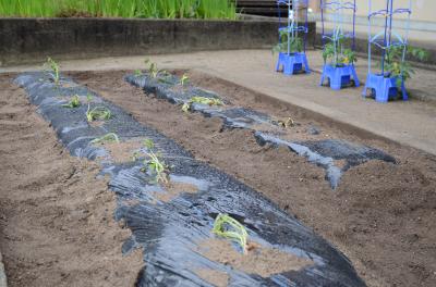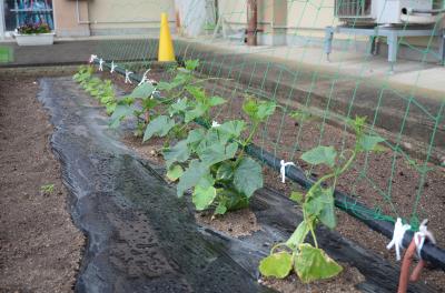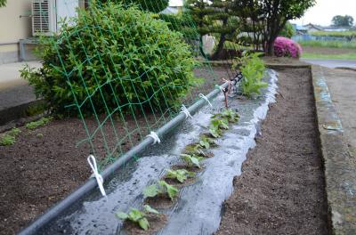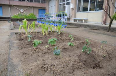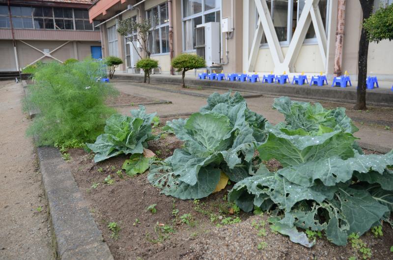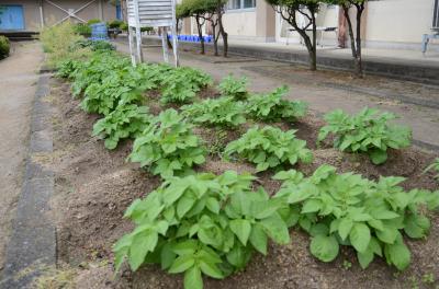 学校にとっては残念な雨ですが、子どもたちや用務員さんが育てている野菜や花にとっては恵みの雨です。地域の農家の方々にとっても恵みの雨ですね。校長室前の朝顔やゴーヤの苗も伸びていました。教室前の2年生が育てている野菜も元気です。6年生のジャガイモもとても大きくなりました。1年生の朝顔もたくさんのかわいい双葉がでています。3年生のキャベツやには食べたあとがありますので、きっと青虫がかくれているのでしょう。