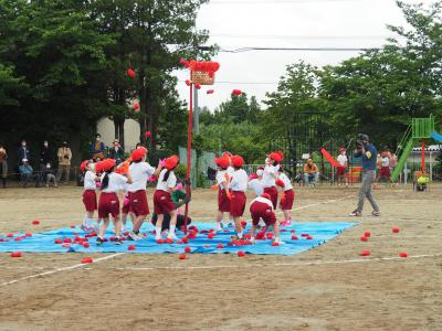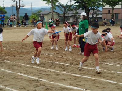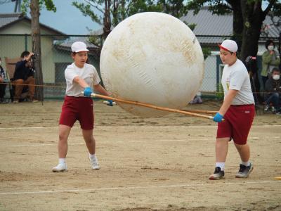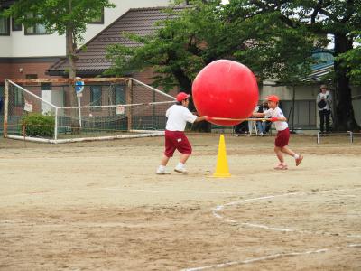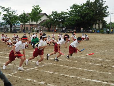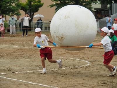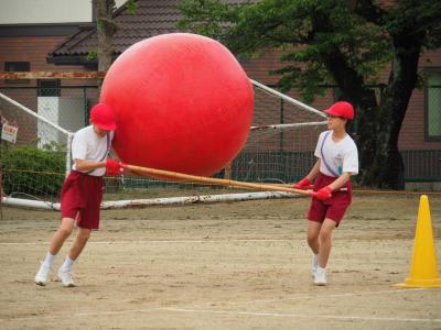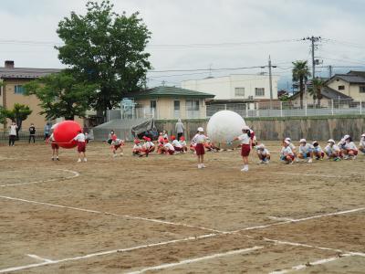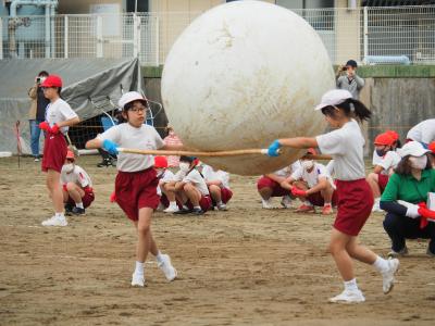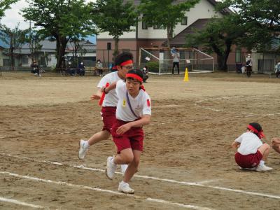 運動会の後半は上学年の大玉運びからスタートしました。その後、下学年赤かな?白かな?、上学年カリモンGO!、鼓笛隊演奏、紅白対抗下学年リレー、そして最後が紅白対抗上学年リレーでした。