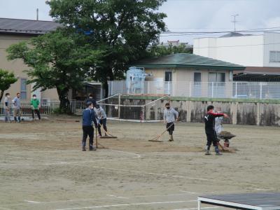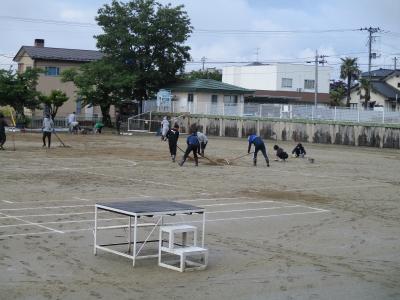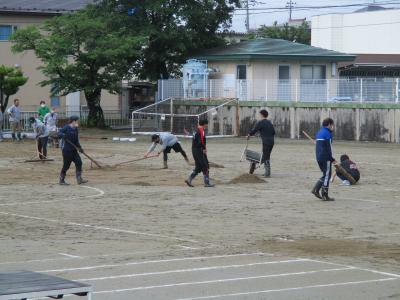 23日に運動会が実施にあたっては保護者様に大変おせわになりました。23日の朝の校庭はあちこちに水たまりがあり、とてもぬかるんでいました。早朝から、PTA会長様をはじめ専門委員の方、PTAソフトチーム及びスポ少ソフト指導者の方々がおいでになり、校庭の水取り、砂入れ、整地、テント組み立て、様々な準備と献身的にご協力いただきました。ご協力いただいたことで、予定時刻に運動会がスタートできました。