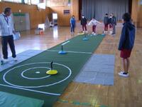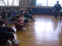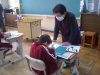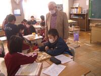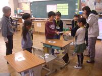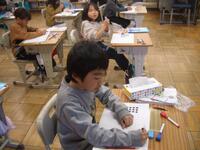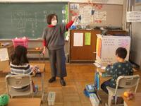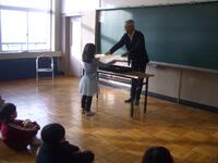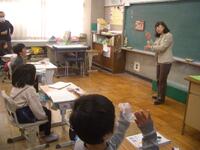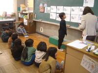 今日は、特別非常勤講師の平塚先生にゲームを通して英単語を教えていただきました。机を一列に並べ、机と椅子に果物のカードを置いてあります。そのカードの果物の名前を唱えると同時に名前のリズムに合わせて棒をたたきます。一つの果物の名前をリズムよく唱えたら、次の果物に移ります。それを繰り返しながら、反対方向から進んできた友達とじゃんけんをして、勝てば、そのまま前に進めるというゲームです。慌ててしまうと、果物の名前が出てこなかったり、唱えることに集中しすぎると棒の動きが止まってしまったり、ゆっくりになったりして、難しい面もあるのですが、2年生の子どもたちはとても楽しそうに取り組んでいました。子どもたちは楽しい雰囲気で自然に英単語を覚えていました。ご指導ありがとうございました。