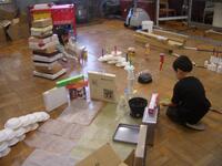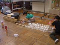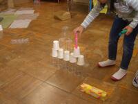 1年教室の隣のプレイルームを使って、紙コップや段ボール、ペンやペットボトルのキャップなど、様々なものを選んで並べて楽しみました。同じ形のものが連続して並んだときの、整った感覚。ものを高く積み上げているときのワクワク感などを味わいながら、楽しく活動できました。