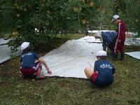 リンゴ畑に到着すると、春にも訪れたリンゴの樹がありました。実が大きくなり色づき始めています。早速、リンゴの世話の仕方について教えていただきました。教えていただいたのは、リンゴに太陽光が当たるようにするための「葉つみ」と「シルバーシート敷き」です。葉つみは、リンゴに光が当たるように近くの葉を落とす作業です。銀色のシートは、太陽の光を反射させるものです。子どもたちは、手際よく、葉の取り方やシートの敷き方を覚え、作業を進めることができました。農家さんのご厚意により、自分で決めたリンゴにシールを貼って、模様が付いた頃にそのリンゴを頂けることになりました。
