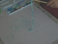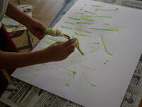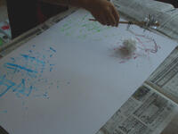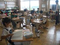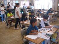 3年生の図画工作科に、身近にある素材を自由に使い、その書き味を試しながら絵画作品を仕上げていく学習、題材名「これでかきたい」があります。この日は、ひも、木の棒、クリップ、綿、毛糸、段ボールなど、様々な素材を使って、思い思いの絵を作り上げていました。使う素材によって、線の太さや絵の具の量に偶然性が生まれ、子どもたちも楽しく取り組んでいました。
