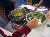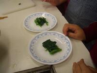 5年生が家庭科で調理実習をしました。ほうれん草をゆでて、食べるまでの実習です。子どもたちは、ほうれん草をゆでた後のゆで汁の色が変わった様子に驚いていました。その後、ゆでたほうれん草に醤油をかけ、おいしそうに頂いていました。「ポパイって知ってる?」と聞いてみましたが、誰も知らないようでした。
