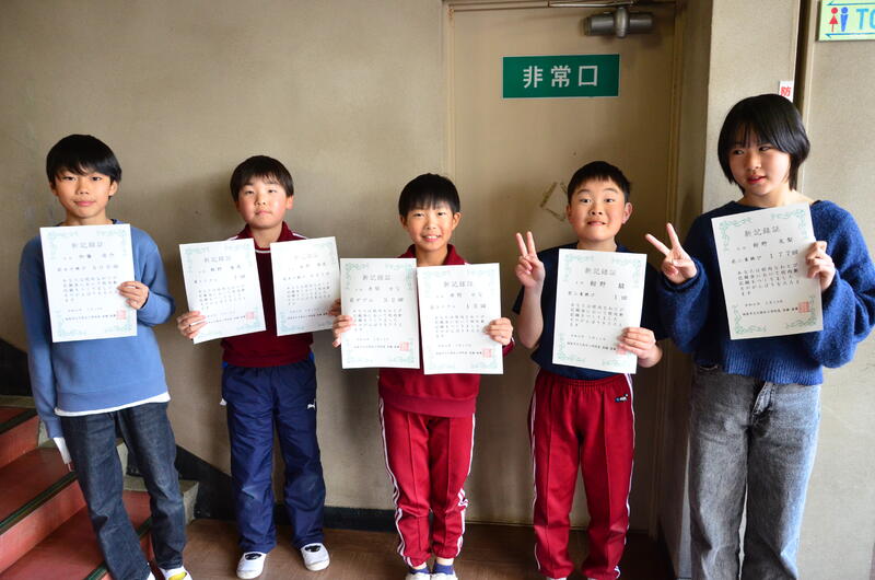 昨日のお昼休み、校内なわとび記録会で新記録を出した児童への新記録証授与式が行われました。放送での式でしたが、新記録を出した5人の子どもたちに記録証が手渡されました。新記録が出た種目は、前二重跳び・前あや跳び・前三重跳び・前ダブル・前トリプル・後あや跳び・後トリプルの7種目です。中には1人で2つの新記録を出した子もいました。本当にがんばりました。おめでとうございます。
