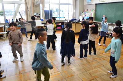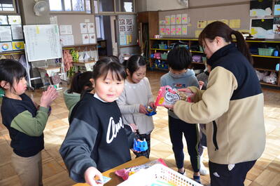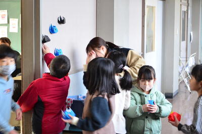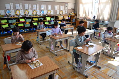明日は節分。でも、お休みの土曜日ですので、今日、各学級では節分にかかわるイベントが行われました。学級集会として、豆まきの前にみんなで楽しめるゲームを行っている学級もありました。