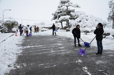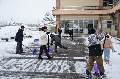 今日は大雪でした。今朝、本校教職員が子どもたちを迎えるために除雪を行いましたが、その後も雪はしんしんと降り続けていました。除雪したはずの昇降口前の広場があっという間に真っ白になりました。少しすると、6年生が出てきて広場の雪かきを始めました。どんどん6年生の人数が増えて、寒さの中、担任の先生とともに笑顔で雪をかいてくれました。下級生のために、学校のために働く素晴らしい6年生です。