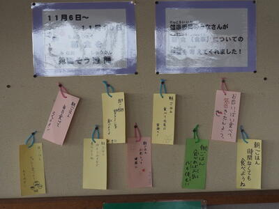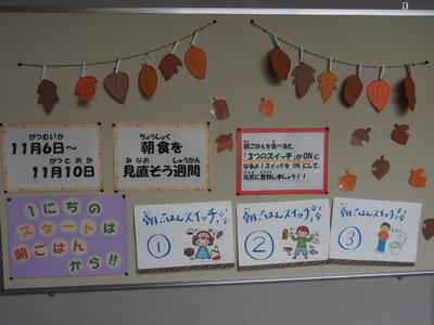 本校では先週まで「朝食を見直そう週間」が行われていました。食育の授業に加え、養護教諭や保健委員会の子どもたちからの働きかけ、生活リズムや朝食摂取の記録と振り返りなどに取り組みました。その結果、6月と比較し朝食時に野菜や汁物をとる児童が増加しました。取組の成果が見られたことはうれしいことです。