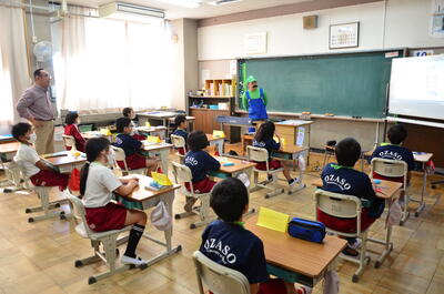 今日はALTの先生の勤務日です。更衣室に入ると、なんと子どもたちの大好きなルイージの姿で出てこられました。外国の文化(祭り)の一つであるハロウィンの雰囲気を子どもたちに味わってほしいとの願いで準備されました。教室に入ると子どもから歓声があがりました。ALTの先生のプレゼントに子どもたちも大喜びです。フォニックスの活動にも目を輝かせ、いつもよりリズムに乗って取り組んでいました。