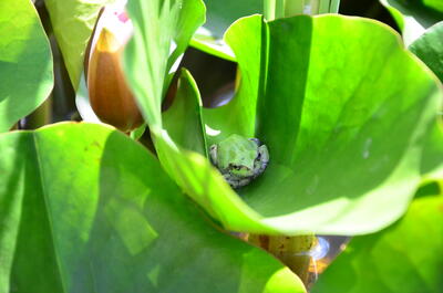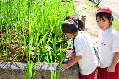 今日も快晴、気持ちのよい朝です。朝の校庭を点検しているとビオトープの水連にカエルが乗っていました。子どもたちは「葉っぱのベッドだね。」「目を開けたまま眠るのかな。」など話していました。また、肩にクワガタをつけた男の子が「今朝、見つけました。」と話しかけてきました。「どこで見つけたの。」と聞くと「校庭の木の下。」と答えてくれました。学校には自然がいっぱいです。